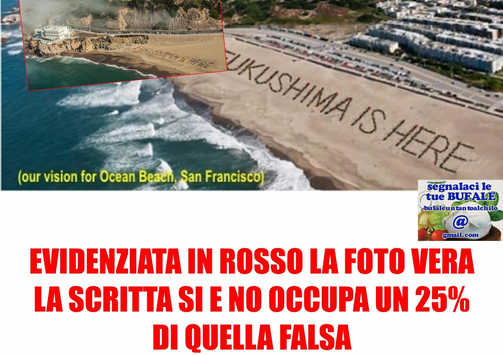 La foto è falsa, falsissima! Se si cerca l’originale, si scopre che è parte del poster per invitare a manifestare sulla spiaggia di Ocean Beach. Siamo di fronte a un tarocco fotografico: la foto è stata manipolata con Photoshop.