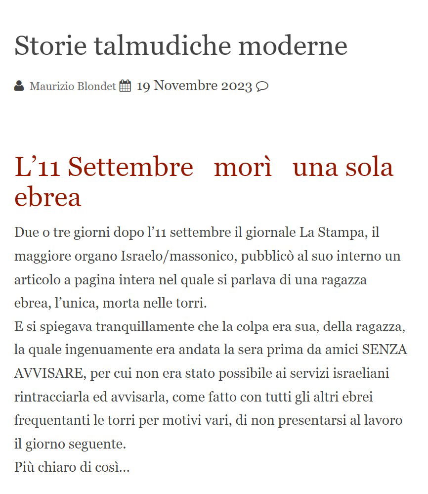 Due o tre giorni dopo l’11 settembre il giornale La Stampa, il maggiore organo Israelo/massonico, proprieta ebrea, pubblicò al suo interno un articolo a pagina intera nel quale si parlava di una ragazza ebrea, l’unica, morta nelle torri.