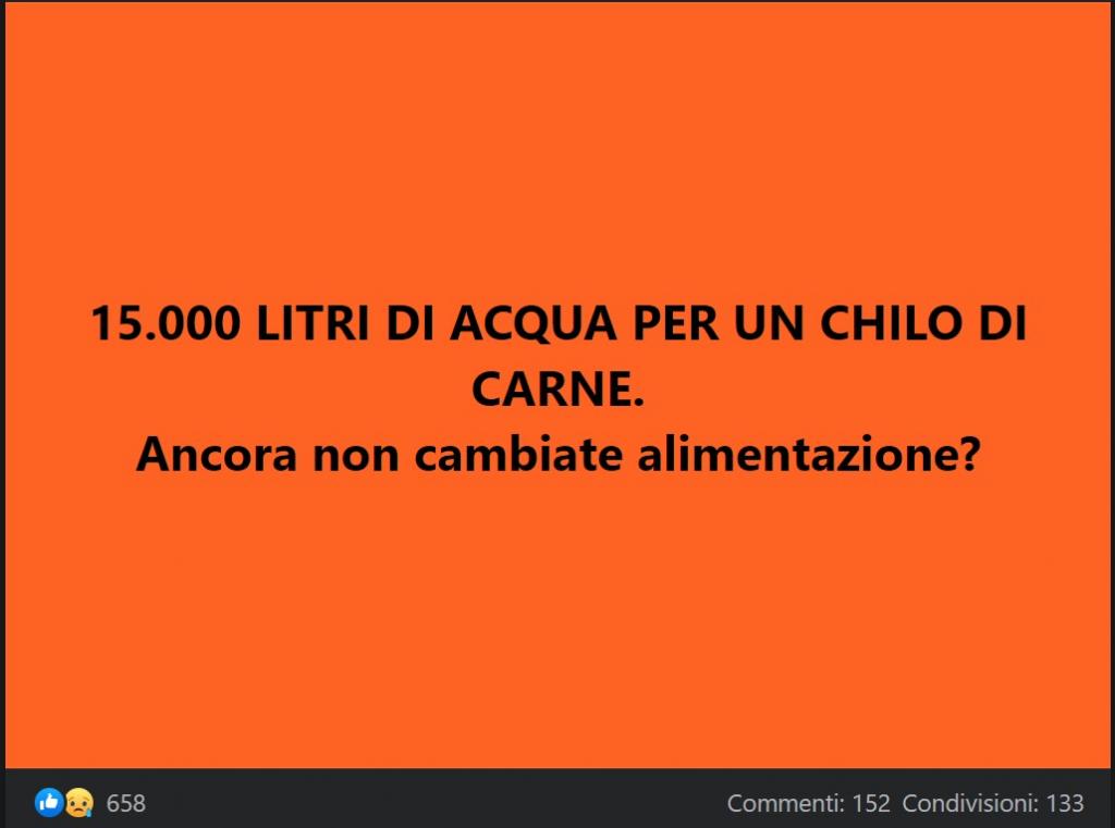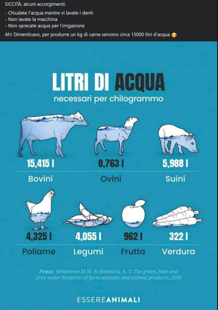 Il messaggio è chiaro: per produrre un chilo di carne ci vogliono 15mila litri d’acqua, quindi soprattutto in questi momenti di carenza idrica dovremmo tutti evitare di mangiare carne, e magari “cambiare alimentazione” diventando vegani o perlomeno vegetariani, per ridurre i consumi di questa preziosissima risorsa.