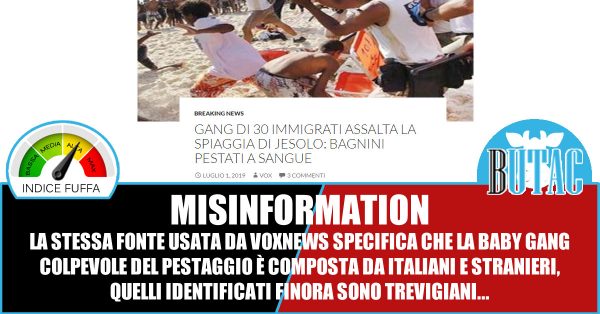 Quindi parte degli assalitori identificati non solo sono italiani, ma sono veneti vicinissimo a Jesolo. Perché VoxNews tutto questo non lo riporta nel suo articolo? Hanno pur usato come fonte Il Giornale che riportava comunque che i 30 (numero comunque sparato a caso) erano in parte italiani. Non l’ha letto l’autore di Vox? O l’ha letto e se ne è infischiato conscio che al suo lettore tipo non interessa sapere di italiani che delinquono, gli unici di cui bisogna riportare la nazionalità, se colpevoli, sono gli stranieri. Perché è solo facendo così che si riesce a inculcare meglio l’idea che gli unici a delinquere nel nostro Paese siano loro.