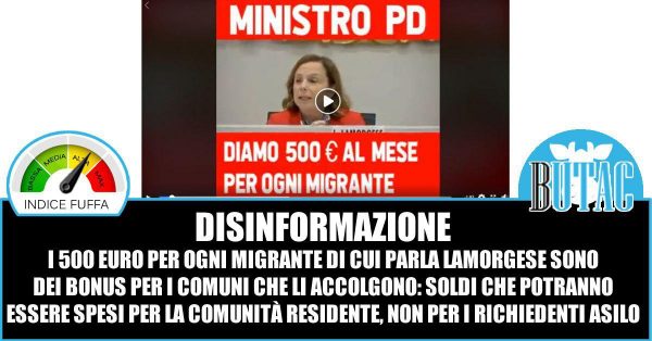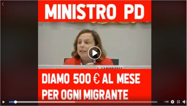 Per trattare questo video facciamo poca fatica: è stato messo in circolazione il 14 settembre 2019. Nel video montato ad arte vediamo Luciana Lamorgese dire: “Diamo 500 euro al mese per ogni migrante” ed è l’affermazione che infiamma subito gli animi.