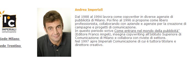 Peccato ci siano cose che non quadrano! L’Andrea Imperiali di Pirelli (che è poi lo stesso di Mediaset, Mondadori e Telecom è nato nel 1964, quindi non ha 43 anni oggi ma 49), l’Andrea Imperiali di Imperiali comunicazioni non ha MAI lavorato per le suddette compagnie, ma (come specifica nel suo profilo) dal 1997 in poi si occupa della propria agenzia pubblicitaria (citata anche dai SanAndreasLab) e dell’insegnamento presso l’Istituto Superiore di Comunicazione di Milano. L’Andrea Imperiali della Pirelli (e tutte le altre) è di Roma, quello dell’Imperiali comunicazioni credo di Cremona, quindi stiamo parlando di due persone diverse, o sbaglio?