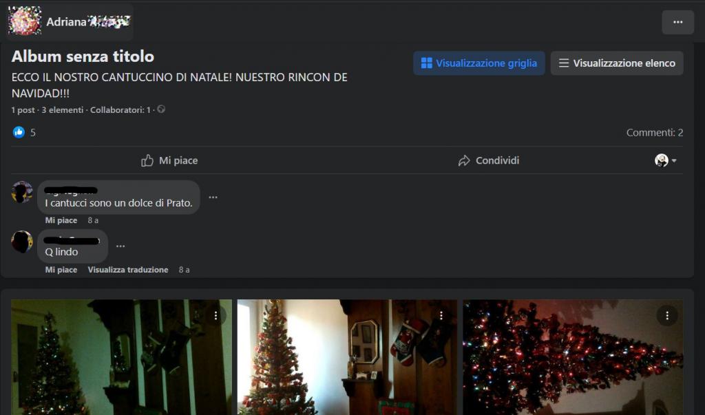 L’account di Faticoni è chiaramente un fake, quello di Adriana meno, ed è per questo che mi sono messo a scrollare ogni immagine condivisa da quel profilo, chiamiamola una ricerca antropologica su come si è evoluto un profilo di disinformazione. Andando a ritroso nel tempo, tra le prime foto pubbliche condivise da Adriana nel 2013, troviamo un post dell’8 dicembre con un alberello di Natale. Il post è in italiano e spagnolo:
