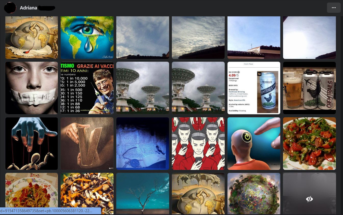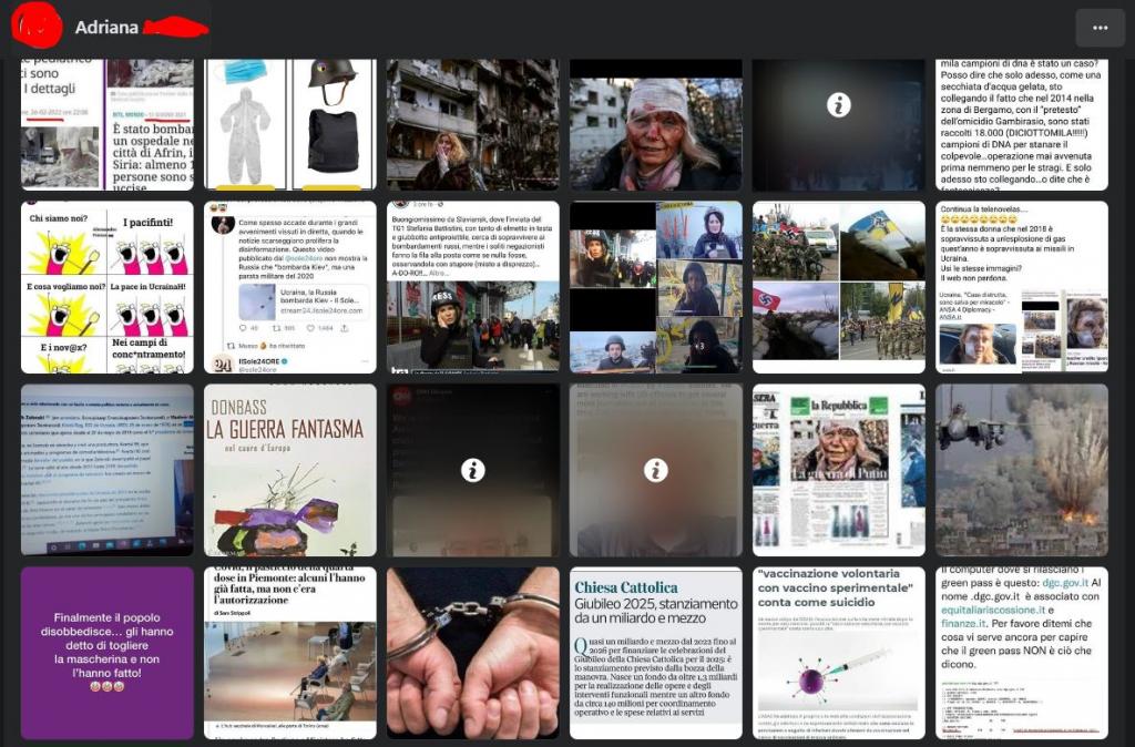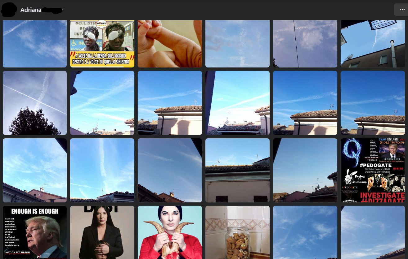 Nei post di Adriana ho trovato tonnellate di immagini che noi o i nostri colleghi abbiamo trattato negli anni, ma Adriana non legge i fact-checker (che nella sua bolla sono l’equivalente più o meno del male assoluto), lei segue OPPT, il Greg, Silver, ByoBlu, Meluzzi, mi ha fatto impressione rendermi conto che quasi non si fila giornalisti della notorietà di Porro e Paragone, rispetto a quanti altri assoluti sconosciuti da social screenshotta e condivide.