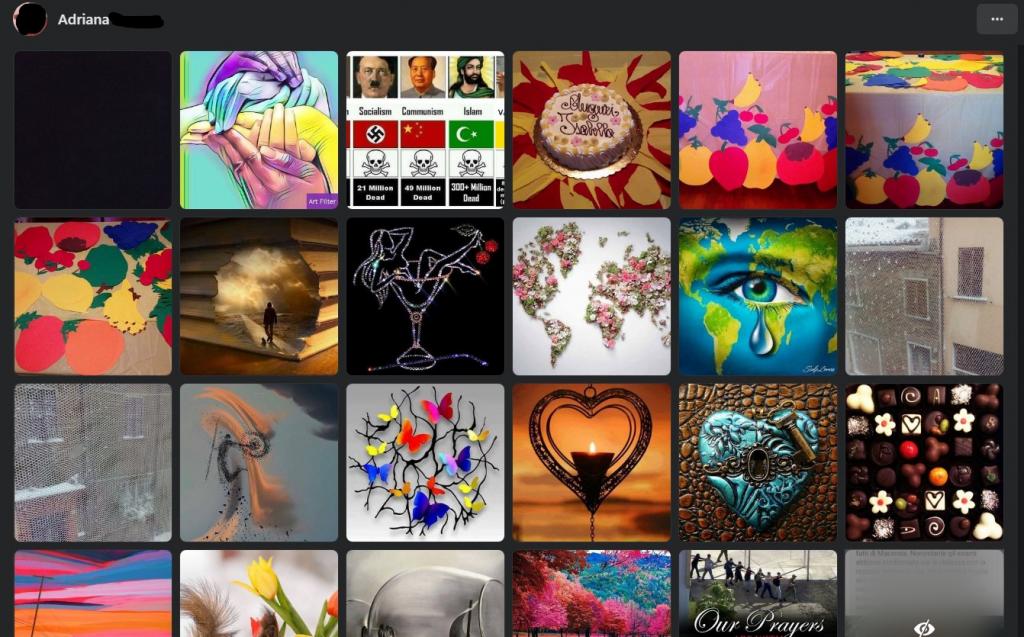 Abbiamo preso in considerazione solo pochi mesi, ma da maggio a novembre 2018 Adriana è passata da solare e allegra sudamericana residente in Italia a complottista che condivide solo cose che mettono tristezza e depressione. Se è un profilo reale, vedere questa caduta nel buio fa malissimo: