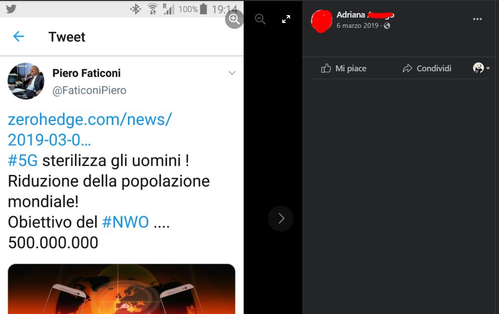 Nei post di Adriana ho trovato tonnellate di immagini che noi o i nostri colleghi abbiamo trattato negli anni, ma Adriana non legge i fact-checker (che nella sua bolla sono l’equivalente più o meno del male assoluto), lei segue OPPT, il Greg, Silver, ByoBlu, Meluzzi, mi ha fatto impressione rendermi conto che quasi non si fila giornalisti della notorietà di Porro e Paragone, rispetto a quanti altri assoluti sconosciuti da social screenshotta e condivide.