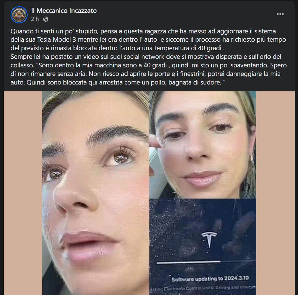 Il testo del post: Quando ti senti un po’ stupido, pensa a questa ragazza che ha messo ad aggiornare il sistema della sua Tesla Model 3 mentre lei era dentro l’ auto e siccome il processo ha richiesto più tempo del previsto è rimasta bloccata dentro l’auto a una temperatura di 40 gradi . Sempre lei ha postato un video sui suoi social network dove si mostrava disperata e sull’orlo del collasso. “Sono dentro la mia macchina sono a 40 gradi , quindi mi sto un po’ spaventando. Spero di non rimanere senza aria. Non riesco ad aprire le porte e i finestrini, potrei danneggiare la mia auto. Quindi sono bloccata qui arrostita come un pollo, bagnata di sudore. “