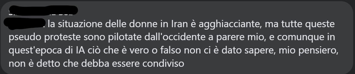 …la situazione delle donne in Iran è agghiacciante, ma tutte queste pseudo proteste sono pilotate dall’occidente a parere mio, e comunque in quest’epoca di IA ciò che è vero o falso non ci è dato sapere, mio pensiero, non è detto che debba essere condiviso.