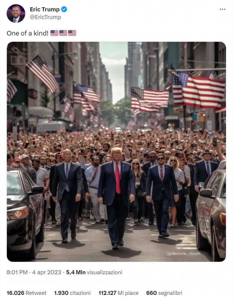 Il 4 aprile 2023 sul profilo di Eric Trump è apparso questo tweet: