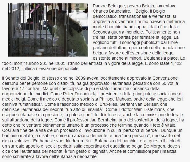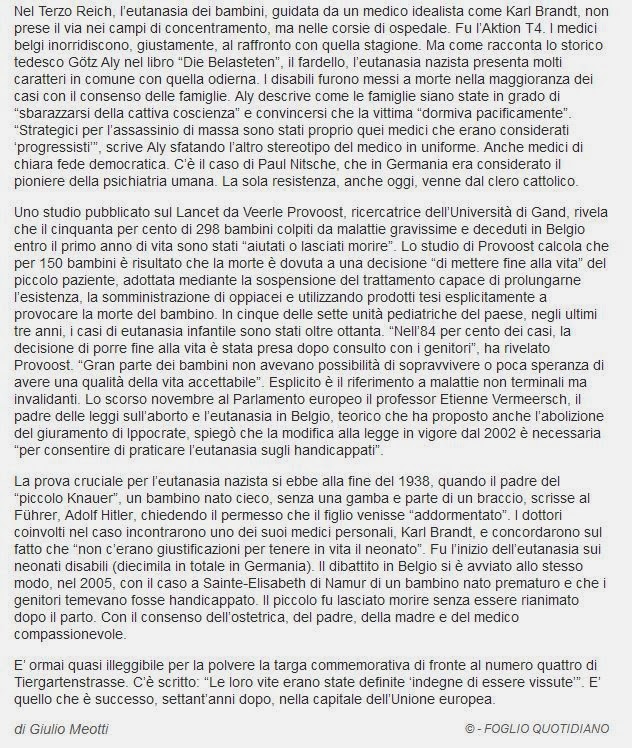 Ora, quello che ti chiedo è: sarebbe opportuno fare un po’ di fact checking in modo che la gente riesca a capire che sterminio nazista e evitare la sofferenza inutile a bambini senza futuro, sono 2 cose diverse. Io non credo proprio che in Belgio vogliano cominciare con lo sterminio di massa dei disabili per motivi di soldi. No. Non credo proprio.