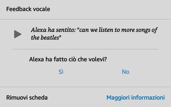 Questo è un esempio di quanto Alexa mantiene nella sua memoria, i miei figli stamattina hanno chiesto ad Alexa di ascoltare più canzoni dei Beatles.