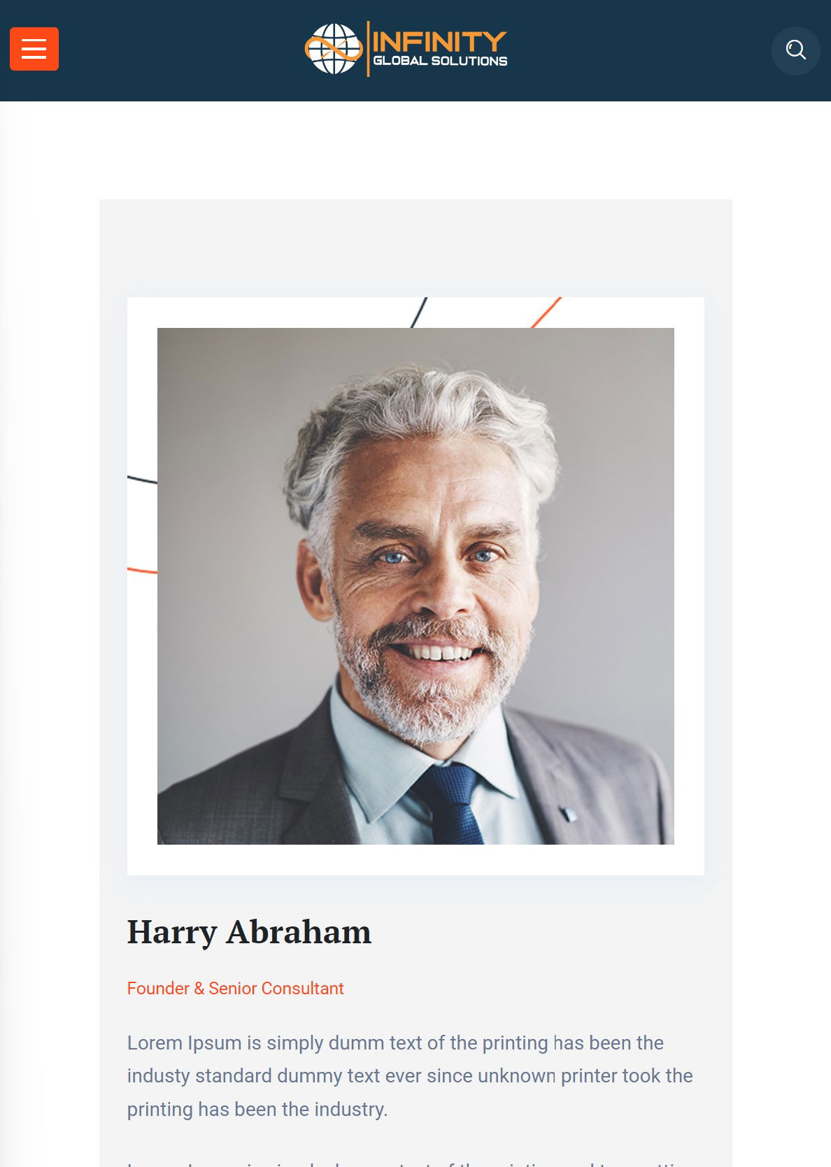 Oltretutto, cercando il nostro Abraham, troviamo un’altra azienda che usa la sua faccia come fondatore, ma qui invece che Shelton si fa chiamare Harry Abraham. Peccato che gli astuti truffatori della Infinity Global Solutions si siano dimenticati di completare la scheda dell’esimio personaggio, che come descrizione riporta il più classico dei testi generici, il Lorem Ipsum…
