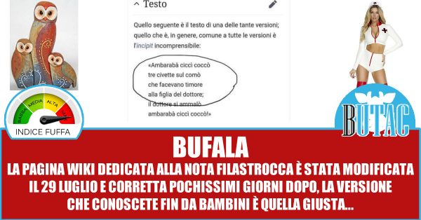 Fosse in realtà “che facevano timore”. Fonte? Wikipedia, l’enciclopedia libera modificabile dagli utenti. Altre fonti? Nessuna. Eppure sono tanti quelli che continuano a condividere questa versione dove le civette invece che fare l’amore con la figlia del dottore si limitavano a farle timore. Pochi però hanno fatto qualche ricerca, pochissimi sono andati a verificare sulla stessa wiki come stessero le cose.