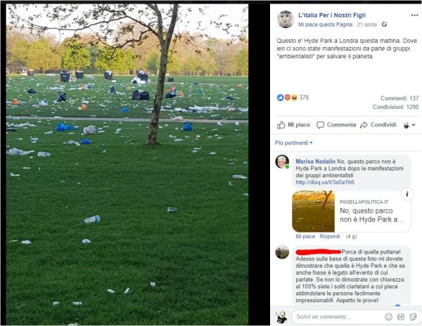 Nell’immagine si vede un prato verde, sporcato da cartacce e rifiuti vari. Nello screenshot però potete notare come l’efficiente Marisa sbufalasse già la storia con un link a Pagella Politica che il 22 aprile aveva trattato la foto, con un velocissimo articolo sufficiente a smentire i fatti narrati da L’Italia per i nostri figli.