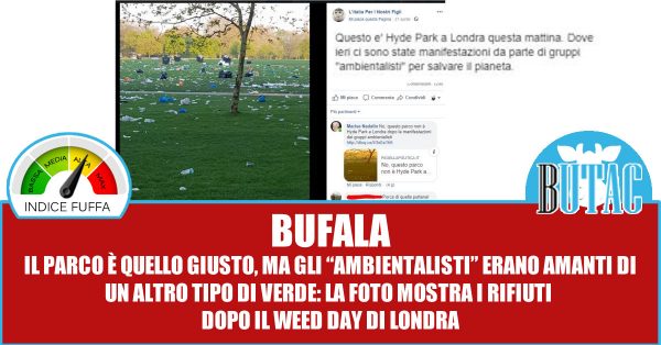 A Londra l’evento si è tenuto a Hyde Park (qui la pagina dell’evento su Facebook). L’immagine pubblicata mostra così il parco londinese dopo l’evento pro cannabis e non dopo le manifestazioni di “gruppi ambientalisti”, come si può verificare qui, qui e qui. Inoltre, negli anni passati il 420 a Hyde Park era stato criticato per la sporcizia prodotta.