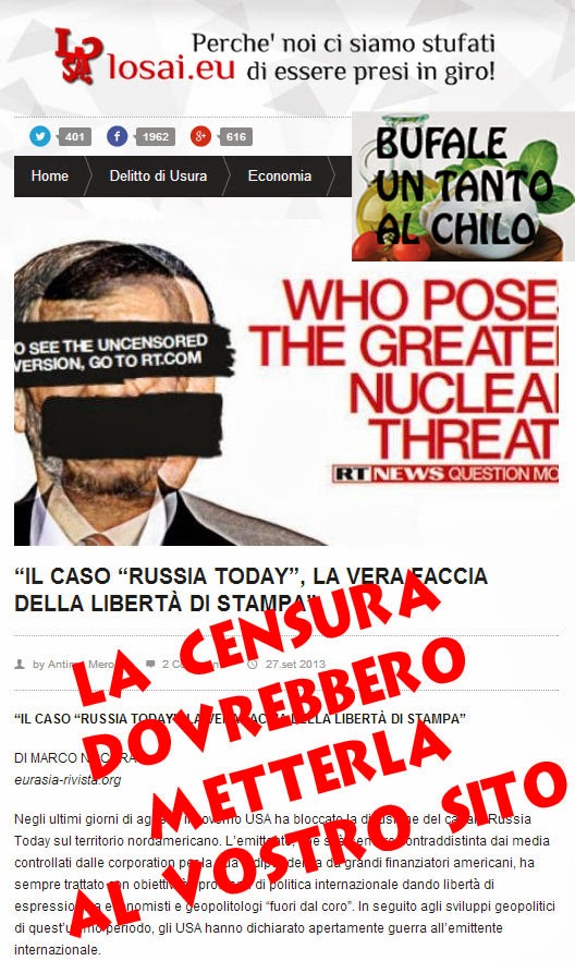 Ci raccontano di come il governo americano abbia censurato il canale RussiaToday su tutto il nordamerica! Cacchio, è una notizia grossissima, cose così credevamo succedessero in paesi sottomessi a delle dittature, oscurare un canale televisivo di lingua inglese che ha i propri uffici americani a Washington è grossa, nemmeno i canali arabi vennero oscurati durante i fatti del 9/11th.