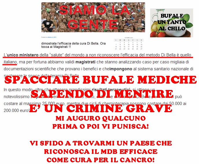 Il Metodo Di Bella non è riconosciuto come efficace dall’Organizzazione Mondiale della Sanità, pertanto è considerato INEFFICACE in tutti i ministeri della salute, ci sono paesi dove è praticato privatamente ma questo non vuole dire che sia riconosciuto dalla medicina ufficiale. Solo che questi sparvieri han trovato nuovi modi per far su dei soldini. Auguro agli pseudo giornalisti che spacciano queste notizie la GALERA, perché raccontare BALLE di questo tipo può causare GRAVI DANNI!