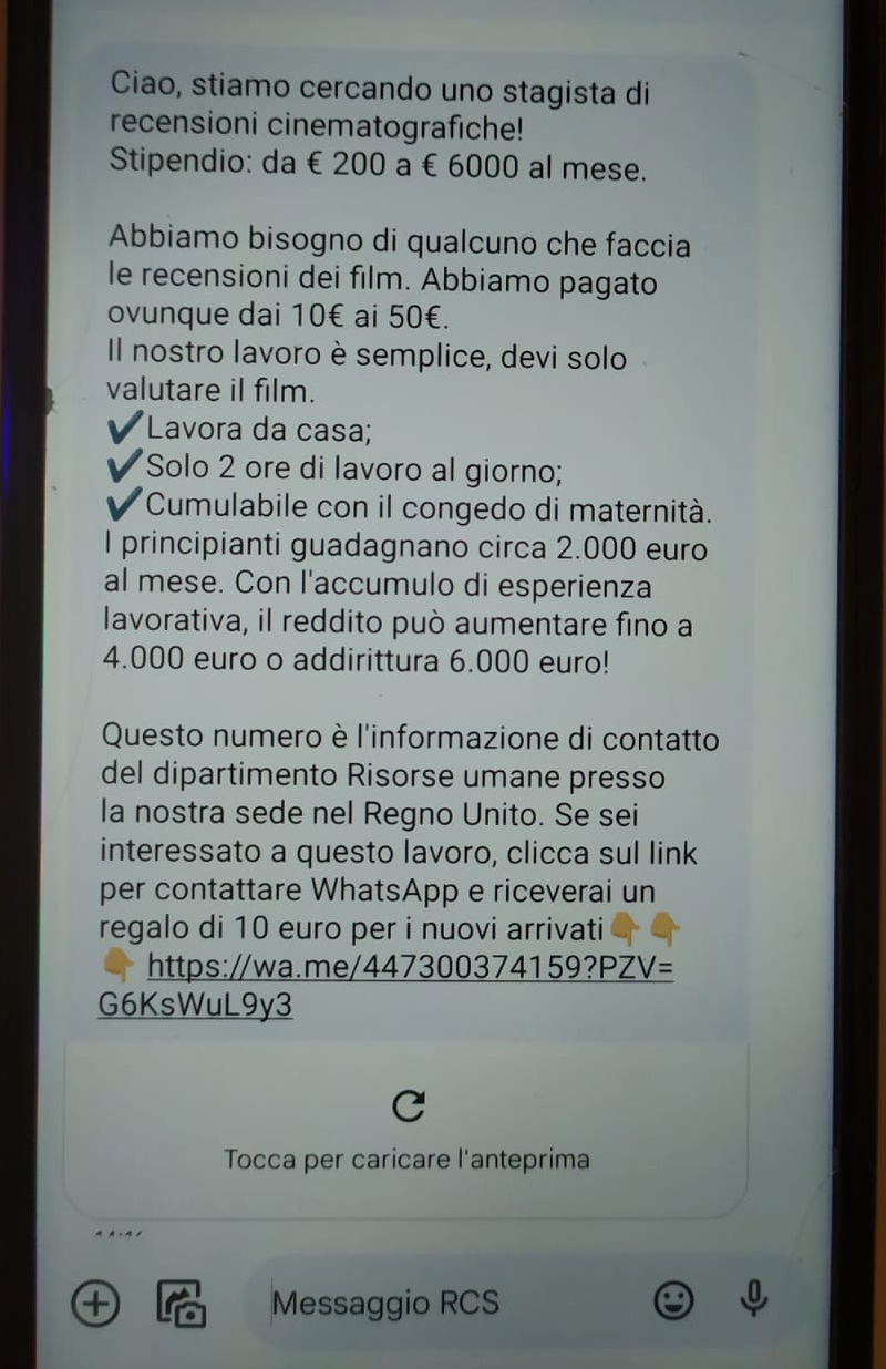 - Contatto tramite WhatsApp: è vero che WhatsApp viene usato anche per comunicazioni professionali, ma è insolito usarlo per comunicazioni relative a offerte di lavoro, soprattutto se il primo contatto avviene tramite un link cliccabile anziché attraverso un processo di candidatura formale.