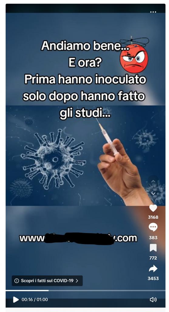 Ci avete segnalato un video su TikTok, un video che diffonde disinformazione antivaccinista senza fonte alcuna. Vi mostriamo solo uno screenshot: