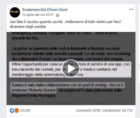 Il post facebook riporta: “non fate il vaccino quando uscirà…metteranno di tutto dentro per farci diventare degli zombie”