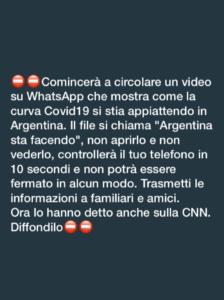 Comincerà a circolare un video su WhatsApp che mostra come la curva Covid19 si sta appiattendo in Argentina. Il file si chiama “Argentina sta facendo”, non aprirlo e non vederlo, controllerà il tuo telefono per 10 secondi e non potrà essere fermato in alcun modo. Trasmetti le informazioni a familiari e amici. Ora lo hanno detto anche sulla CNN. Diffondilo