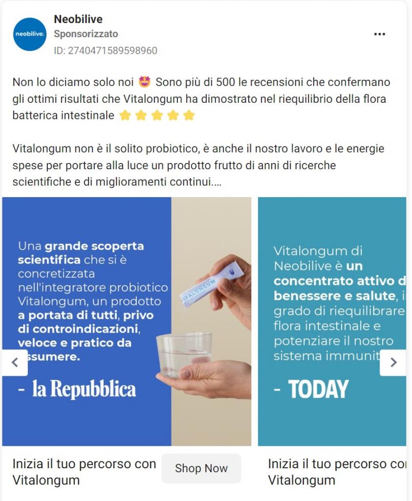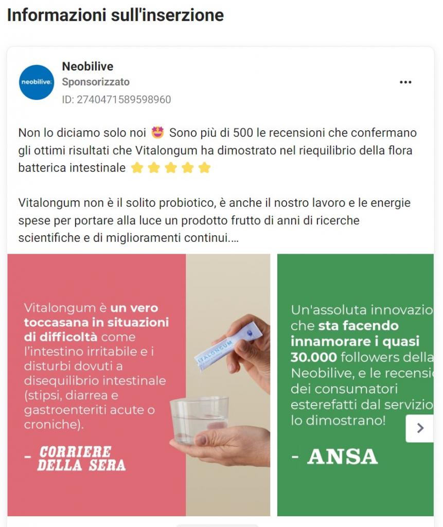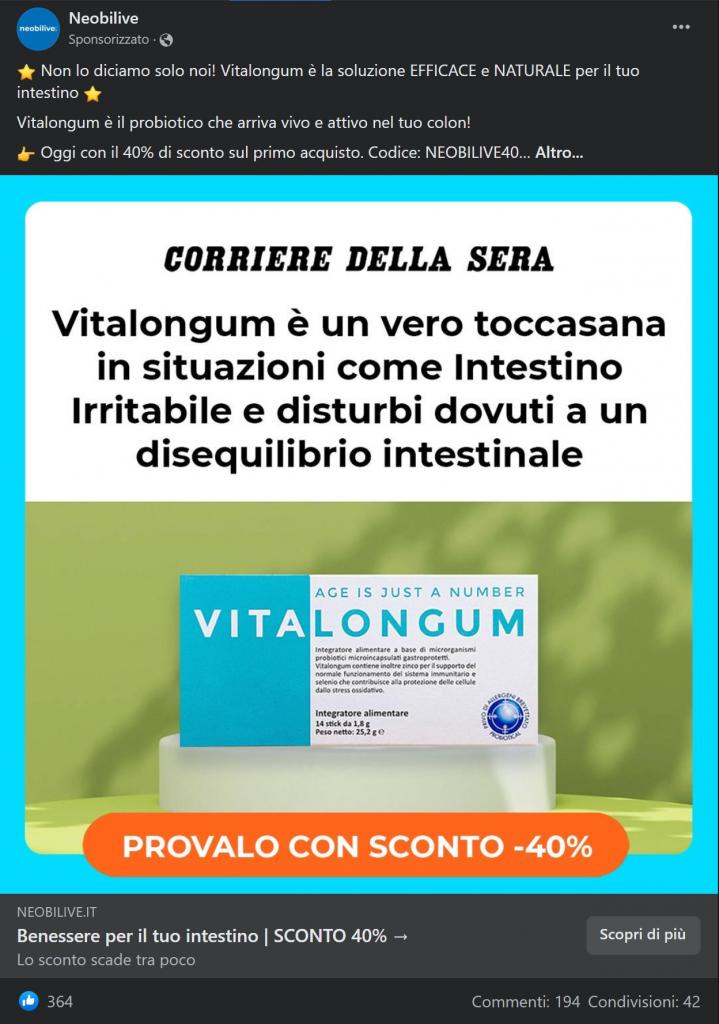 Il prodotto è Vitalongum, un probiotico che dovrebbe appunto aiutare in situazioni come quelle descritte nel post sponsorizzato che vedete qui sopra.