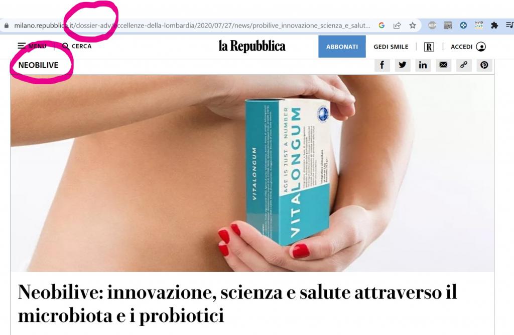 Corriere, Ansa, Today, La Repubblica, sono tante le testate che a detta delle pubblicità di questo magico probiotico ne avrebbero esaltato le proprietà. Io, lettore pigro che vedo pubblicità del genere, mi convincerò che appunto le testate citate abbiano chiesto a dei medici un parere e abbiano pubblicato articoli entusiastici in merito. Invece le cose non stanno proprio così, basta cercare le frasi estrapolate per scoprire che quelle che vengono condivise come recensioni entusiastiche pubblicate su testate nazionali altro non sono che publiredazionali scritti dalla stessa azienda.
