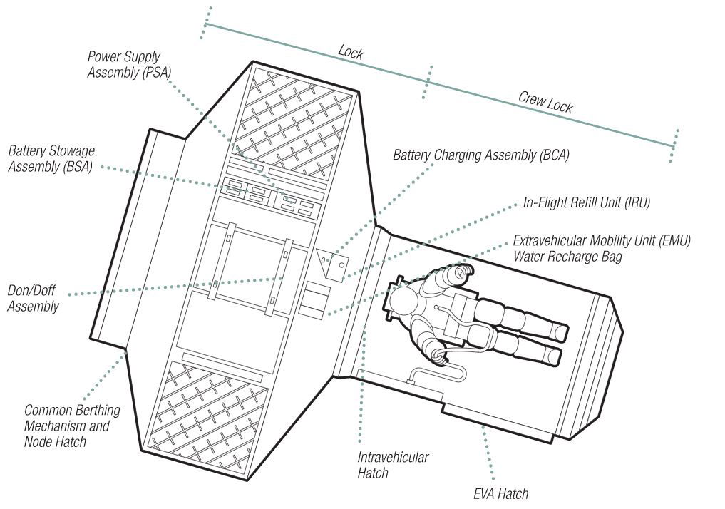 Le due sezioni sono separate tra loro e a loro volta sono separate dallo spazio vitale dell’ISS, qui vedete lo schema del Quest Airlock Module: