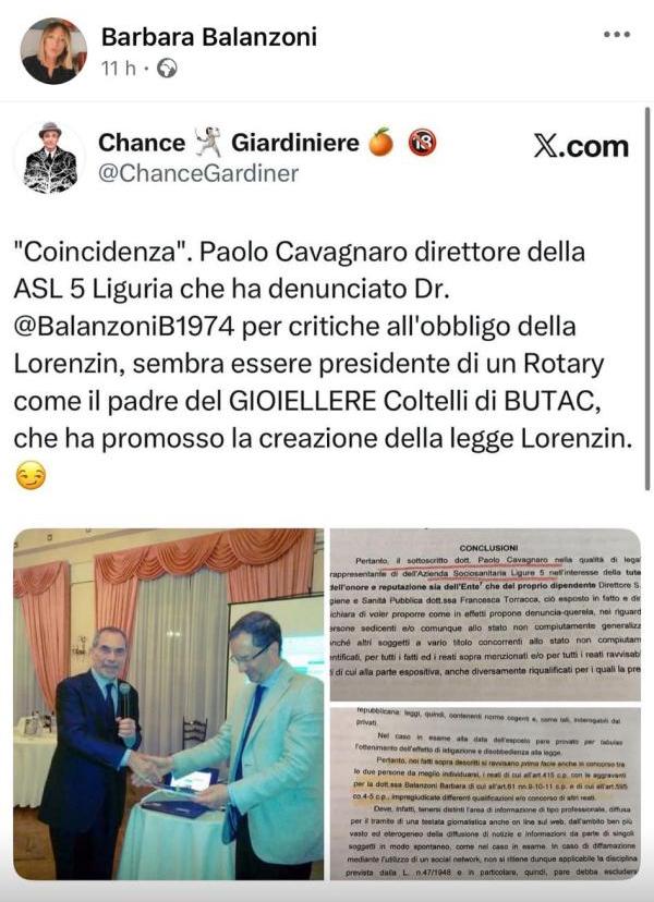 Nello screenshot abbiamo un post di Chance Giardiniere (un anonimo vigliacco che da anni ha fatto della diffamazione sui social il suo cavallo di battaglia) condiviso da Barbara Balanzoni, il testo: “Coincidenza”. Paolo Cavagnaro direttore della ASL 5 Liguria che ha denunciato Dr. @BalanzoniB1974 per critiche all’obbligo della Lorenzin, sembra essere presidente di un Rotary come il padre del GIOIELLERE (sic) Coltelli di BUTAC, che ha promosso la creazione della legge Lorenzin. 😉