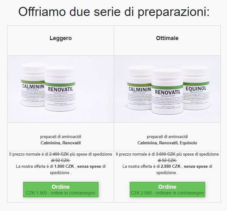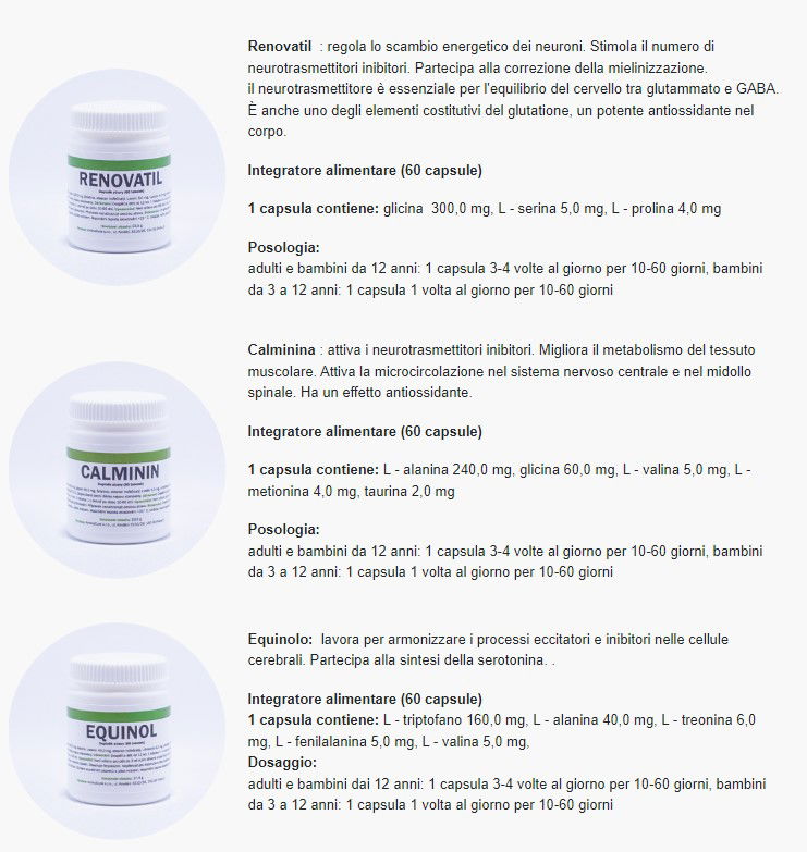 Sul sito sono molto attenti a non pubblicizzare chiaramente i loro prodotti, ma basta andare nelle FAQ per rendersi conto che lo scopo del sito non è fare consulenze ma vendere un preparato a base di aminoacidi e nulla di più. Ma basta una ricerca più approfondita per trovare i loro prodotti, che, come potevate immaginare non sono altro che integratori alimentari: Calminin, Renovatil e Equinol.