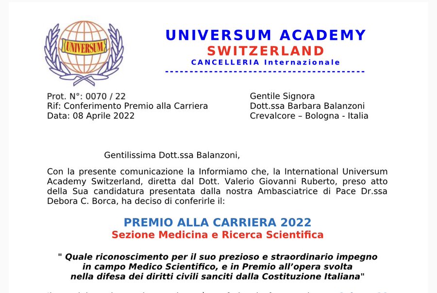 Con la presente comunicazione la informiamo che, la International Universum Academy Switzerland, diretta dal Dott. Valerio Giovanni Ruberto, preso atto della sua candidatura presentata dalla nostra Ambasciatrice di Pace Dr.ssa Debora C. Borca, ha deciso di conferirle il: