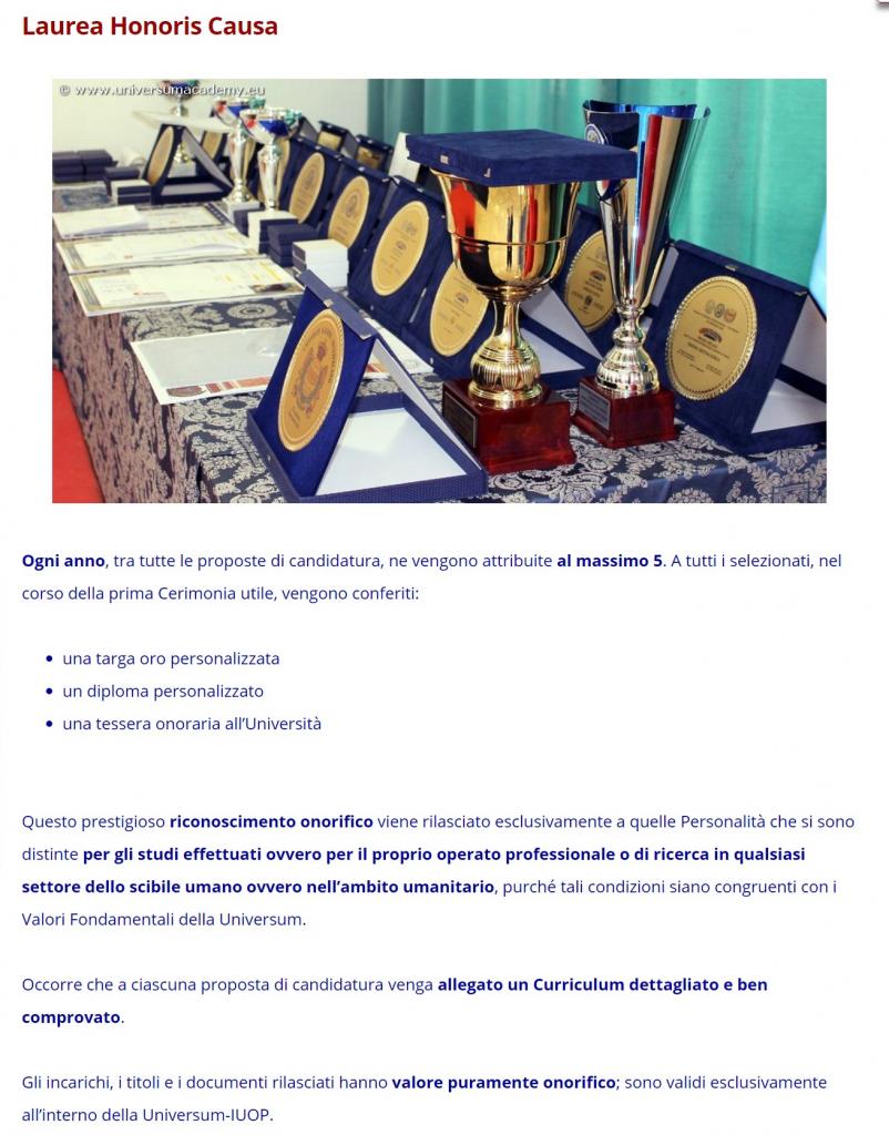 L’associazione, oltre alla parte “Academy”, ne ha anche una che viene chiamata Università, impropriamente a nostro avviso visto che non vi si tengono lezioni universitarie. In compenso però si forniscono lauree honoris causa: