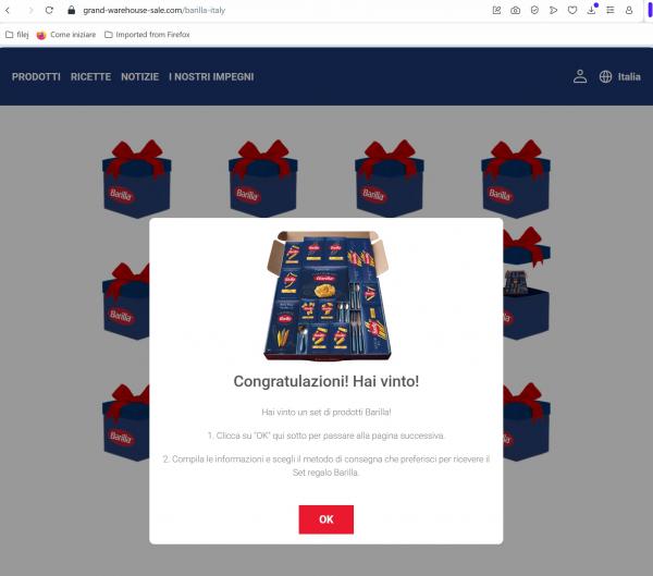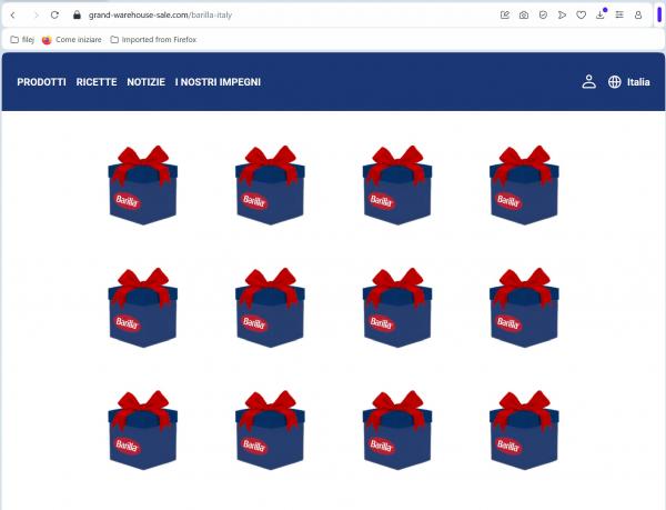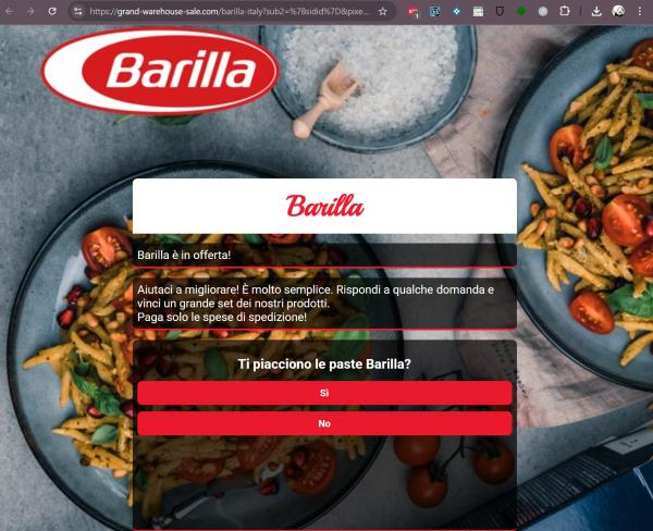 Pagine che andrebbero bloccate e i creatori delle stesse identificati, perché sono tutte collegate allo stesso modello di truffa online. Se cliccate sui post venite reindirizzati non sul sito che si vede come anteprima del link sotto ai post (barilla.com) ma su grand-warehouse-sale.com dove ci troviamo di fronte al solito “sondaggio” da poche facili risposte: