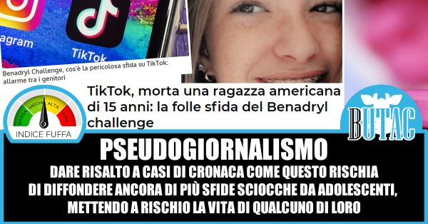 Ci segnalano questo articolo di Science-Based Medicine che spiega la vicenda e fa notare come, oltre alle nostre considerazioni, non ci siano prove che l’adolescente sia deceduta in seguito alla “sfida” su TikTok.