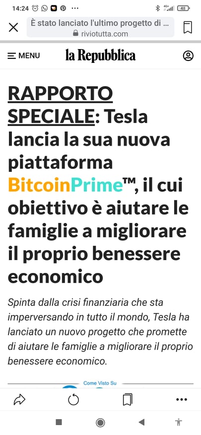Sempre la solita truffa: siete invitati da un finto articolo della stessa testata su cui credevate di aver cliccato a cliccare su altri link che portano ad aprire una posizione con BitcoinPrime, che non è altro che l’ultimo nome usato da questi truffatori, che lo cambiano ormai ogni settimana perché sanno che una volta che ne parlano i siti di debunking poi è facile rendersi conto di essere di fronte a una truffa.