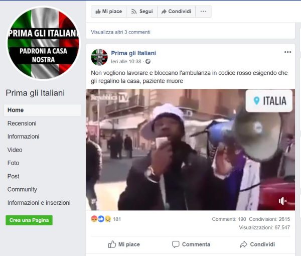 Il video è stato condiviso, in primis, dalla pagina Facebook “Prima gli Italiani”, insieme con un’infinità di altri meme e post grondanti razzismo. Andiamo ad analizzarlo.