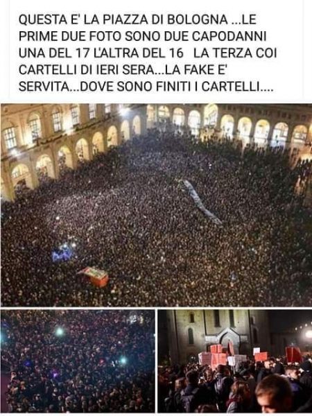 Questa è la Piazza di Bologna… Le prima due foto sono due capodanni una del 17 l’altra del 16 la terza coi cartelli di ieri sera. La fake è servita… dove sono i cartelli?