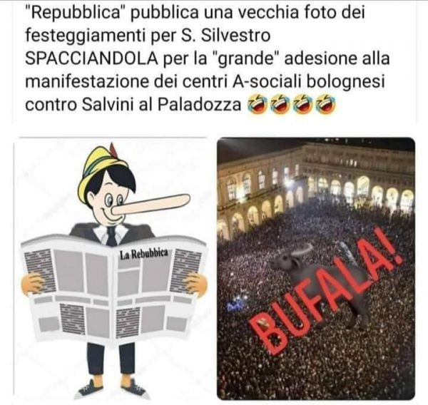 Dove si sostiene che La Repubblica abbia pubblicato foto false della contromanifestazione anti-Lega che si è svolta a Bologna qualche giorno fa. Nei post che vengono fatti girare si dice: