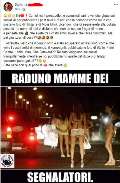 Cari sinistri, pentapdioti e comunisti vari, a voi che girate sul social vk per pubblicare i post miei e di altri che la pensano come me e che postano foto di Hitl@r e di Muss@lini, dicendoci che ci segnalerete alla polizia postale… a nome di tutti vi diciamo che non ce ne può fregar di meno.. e pensate alla 💩 che avete tra i vostri amici invece che fare i giustizieri. Ma poi giustizieri di cosa??🤣🤣🤣🤣 …oltretutto, visto che il comunismo è stato equiparato al fascismo, com’è che voi e i vostri amici di merende, (i kompagni), pubblicate le foto di Stalin, Fidel Castro, Lenin, Mao, Che Guevara?? Tali foto viaggiano sui social tranquillamente, mentre se noi pubblichiamo quelle del duce o di hitl@r veniamo ‘perseguitati’??🤔🙄… Fate pace con quel poco di 🧠 che avete