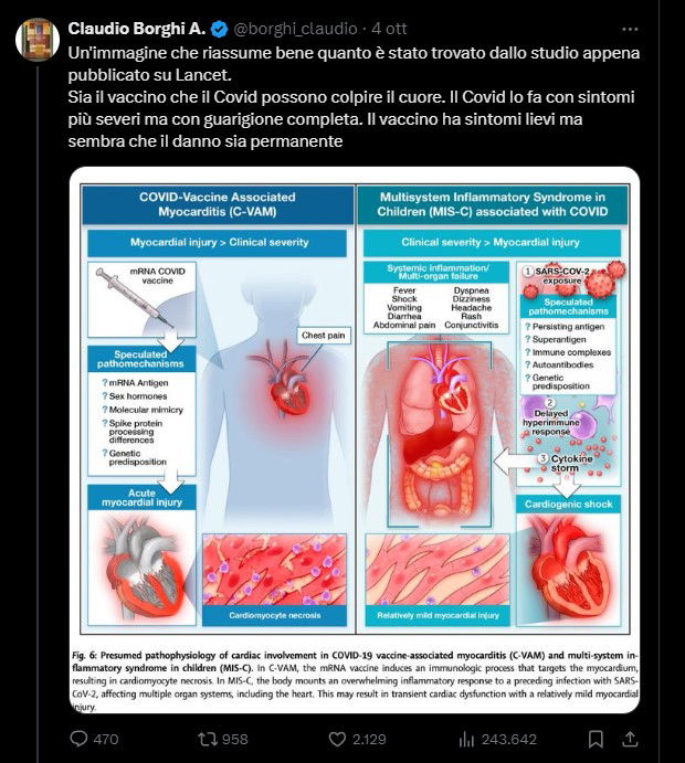 “Un’immagine che riassume bene quanto è stato trovato dallo studio appena pubblicato su Lancet. Sia il vaccino che il Covid possono colpire il cuore. Il Covid lo fa con sintomi più severi ma con guarigione completa. Il vaccino ha sintomi lievi ma sembra che il danno sia permanente” Claudio Borghi