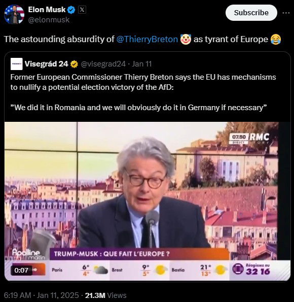 Post che riprende un minuscolo spezzone video di un’intervista a Thierry Breton sulla TV francese. Spezzone in cui Breton dice: