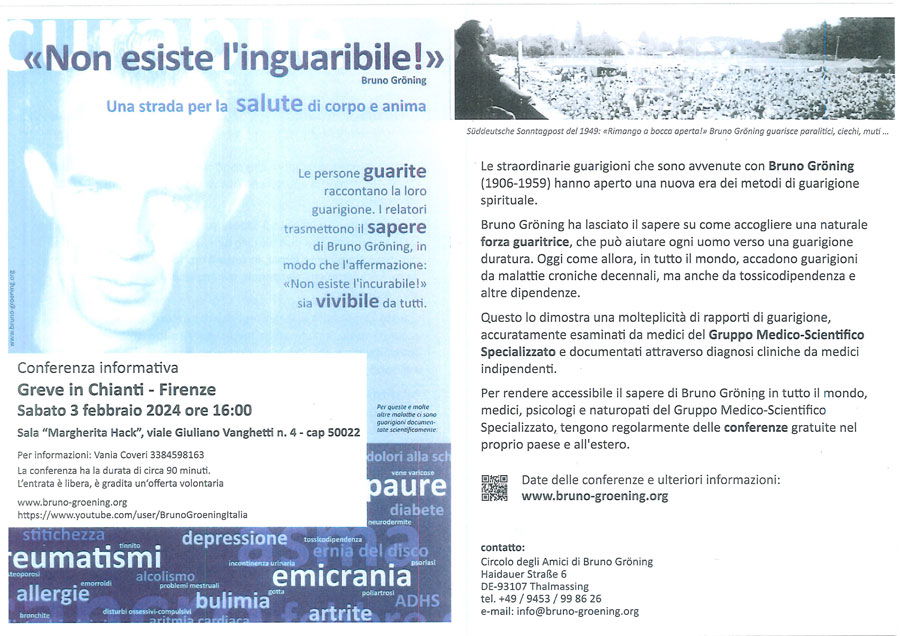 Su BUTAC anni fa avevamo un lungo articolo che raccontava nel dettaglio chi fosse Bruno Gröning e perché bisognava diffidare dal “Circolo degli amici” dello stesso. Purtroppo l’autore del suddetto articolo un giorno ci ha chiesto di rimuovere ogni suo scritto da BUTAC e così quel pezzo è svanito. In rete si trova scarso materiale critico sulla figura di Gröning, materiale che invece si trova in inglese e in tedesco.