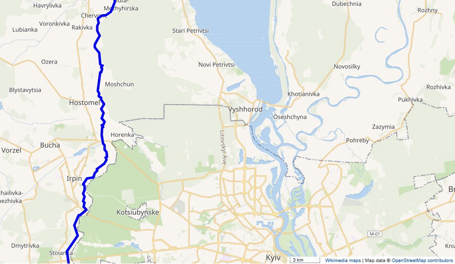Per avere un’idea dell’area di cui parliamo, di seguito trovate una mappa del fiume Irpin con le città menzionate: