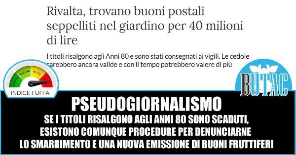 BUFALA, non esiste una rivalutazione per Buoni fruttiferi scaduti, quei buoni hanno validità venti anni (o trenta perché alcune serie degli anni 80 avevano quella come scadenza). Scaduti i quali abbiamo 10 anni per ritirare quanto hanno fruttato altrimenti diventano carta straccia, ve l’abbiamo già spiegato più e più volte, come mai il giornalista de La Stampa non ce lo spiega? E nessuno dei tanti che hanno ripreso la notizia si preoccupa di verificare qualcosa? La risposta la sappiamo già: hanno ricevuto la notizia tramite comunicato da qualche fantomatica agenzia che sta aiutando i fortunati ritrovatori a monetizzare la scoperta. Ma sono sempre i soliti furbetti che stavolta però sono incappati in un intoppo. Nessuna delle testate che ha riportato la notizia, infatti, ha fatto il nome di agenzie coinvolte, ma si capisce da quest’altra frase che qualcosa non torna: