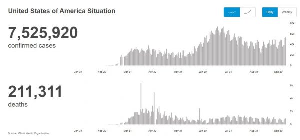I dati sono sicuramente corretti all’8 agosto, ma quei numeri tradotti in persone vogliono dire che negli Stati Uniti da inizio pandemia sono morte, a causa della COVID-19, oltre 200mila persone: negli ultimi mesi circa 750 persone al giorno su tutto il territorio muoiono per la pandemia.