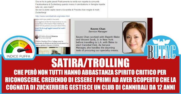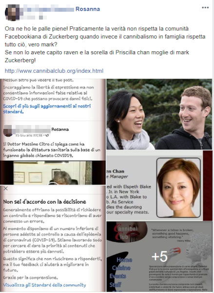 Il post è una lamentela per il fatto che uno dei post pubblicati da Rosanna fosse stato cancellato, in quanto non rispettava la policy di Facebook. Quindi Rosanna, dall’alto delle sue notevoli capacità investigative, ha deciso di rendere pan per focaccia a Mark Zuckerberg, mostrando al mondo quella che lei ritiene essere la sorella di sua moglie Priscilla, Raven Chan, supposta gerente di un club per cannibali. Sì, avete capito bene, un club per cannibali.