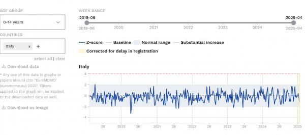 Il grafico viene da EuroMOMO. Se lo analizziamo per fasce d’età, isolando quelle giovanili, scopriamo che nella fascia più giovane non c’è quasi mai stato un picco verso l’alto per quanto riguarda la mortalità, ma solo aumenti lievi: