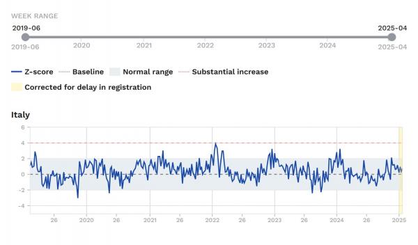 Sta a chi fa specifiche affermazioni portare prove che le sostengano, e nel servizio non viene mostrato niente del genere. Quello qui sotto è il grafico sullo z-score in Italia, per tutte le categorie d’età. Come potete vedere, gli anni che mostrano dei picchi partono da circa metà 2020, in calando nel corso del tempo fino a tornare quasi alla normalità a cavallo dell’inizio del 2024:
