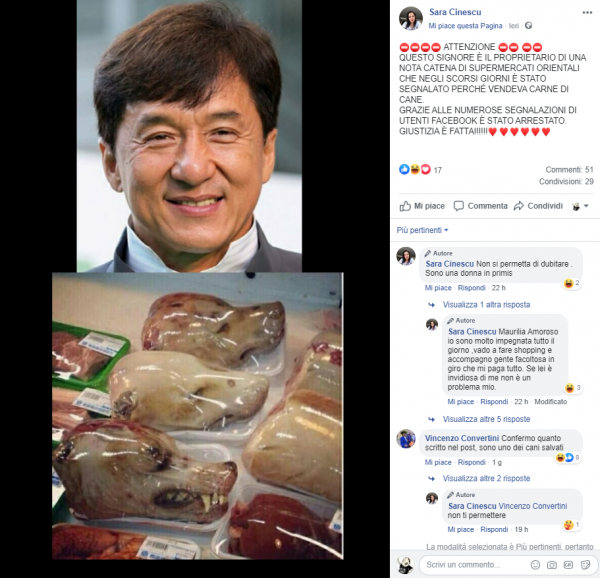 La foto che accompagna il post è quella di Jackie Chan, noto attore e esperto di arti marziali. Ma il problema è che il post più esplicito sulla trollata ha 29 condivisioni e qualche manciata di like, il post senza la faccia di Jackie Chan al momento ha 13555 condivisioni. Tredicimilacinquecentocinquantacinque, contro ventinove. Siamo tutti d’accordo tra gli oltre 13mila che hanno condiviso ci saranno quelli che hanno capito che si tratta di una trollata, ma quanti invece non l’hanno capito? Io ho dato un’occhiata alle condivisioni, sono andato sulle bacheche di alcuni e mi pare che siano molti di più quelli che ci cascano che quelli che non ci cascano. Ho trovato anche un’associazione animalista brasiliana tra le condivisioni…