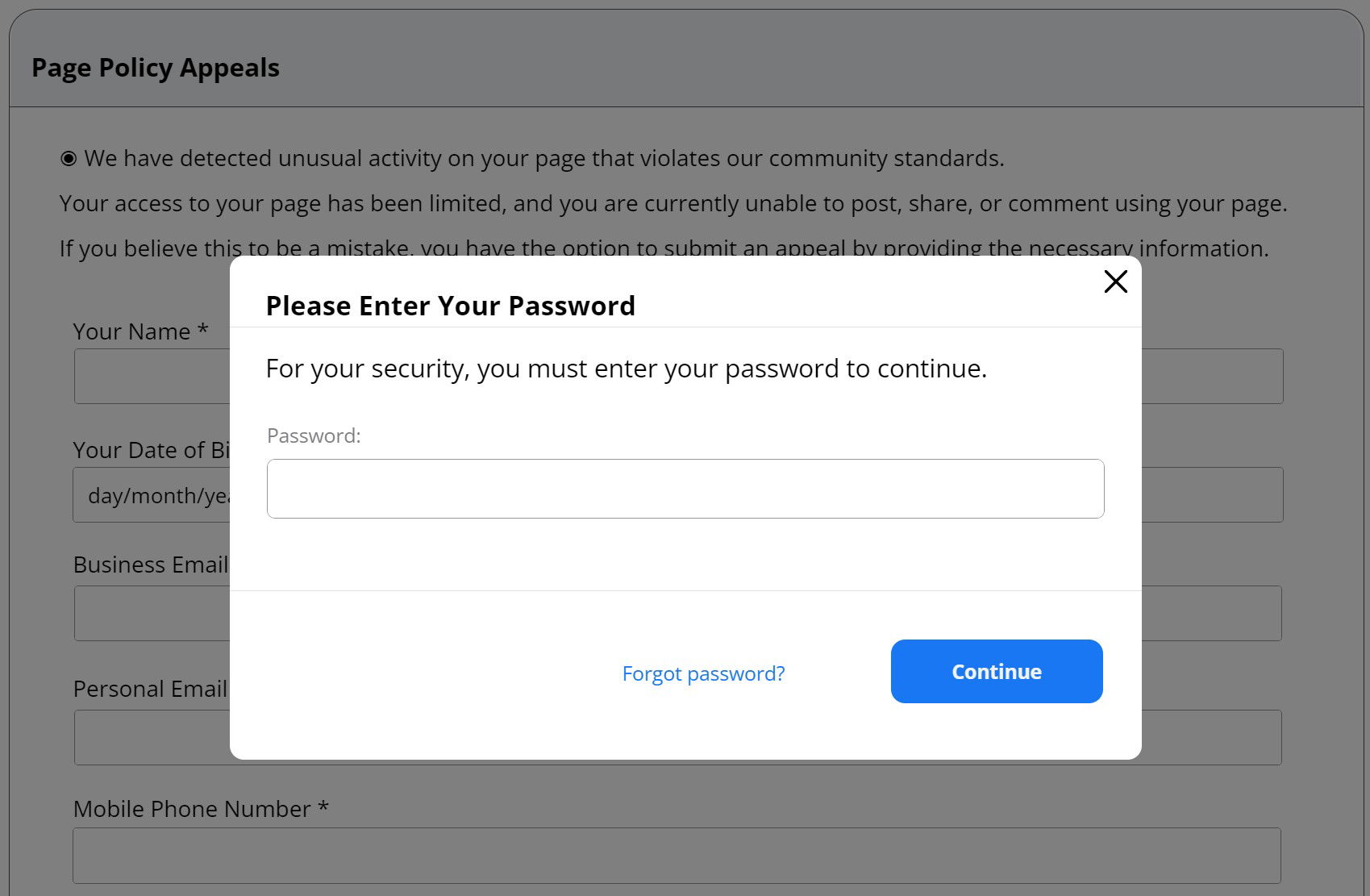 Se cercassimo di cliccare fuori dalla finestra centrale però ci accorgeremmo che solo la parte in cui inserire i dati è funzionante, tutto il resto è falso come una moneta da 3 euro e 50. Una volta compilati i campi, pur essendo in teoria ancora dentro Facebook, ci viene chiesta la password per un controllo di sicurezza.